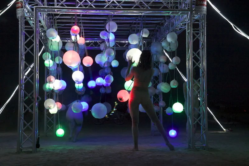 MICRO explores the small universe that is our body and mind. It consists of an 10ft x 14 ft x 10ft structure that has 200 translucent balls hanging from the top of the structure, each ball containing a speaker. When a ball is bumped into it generates a unique sound, and lights up with one of 5 different colors. As people play with the balls they are engulfed by a symphony of lights and sounds surrounding them on all sides.