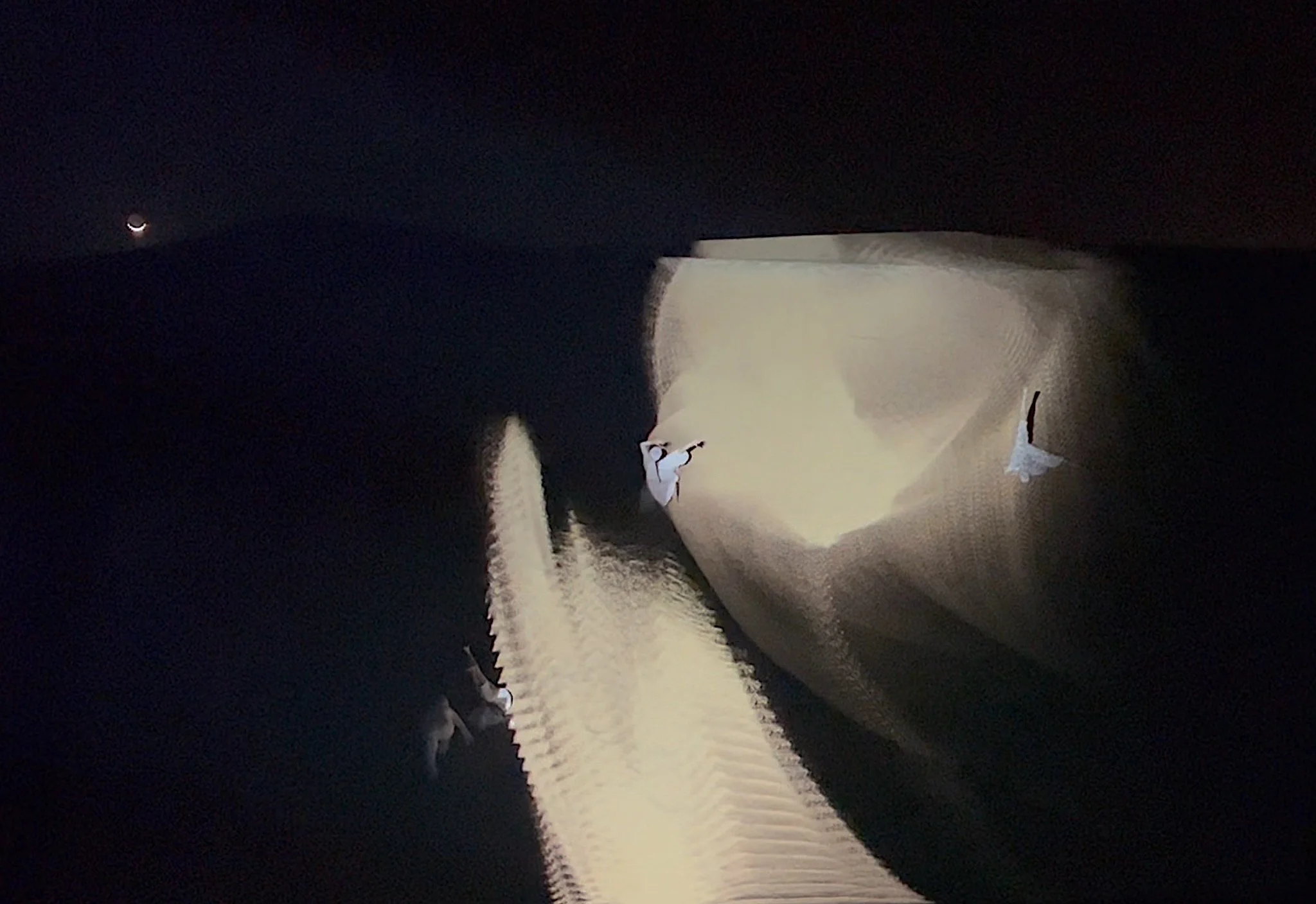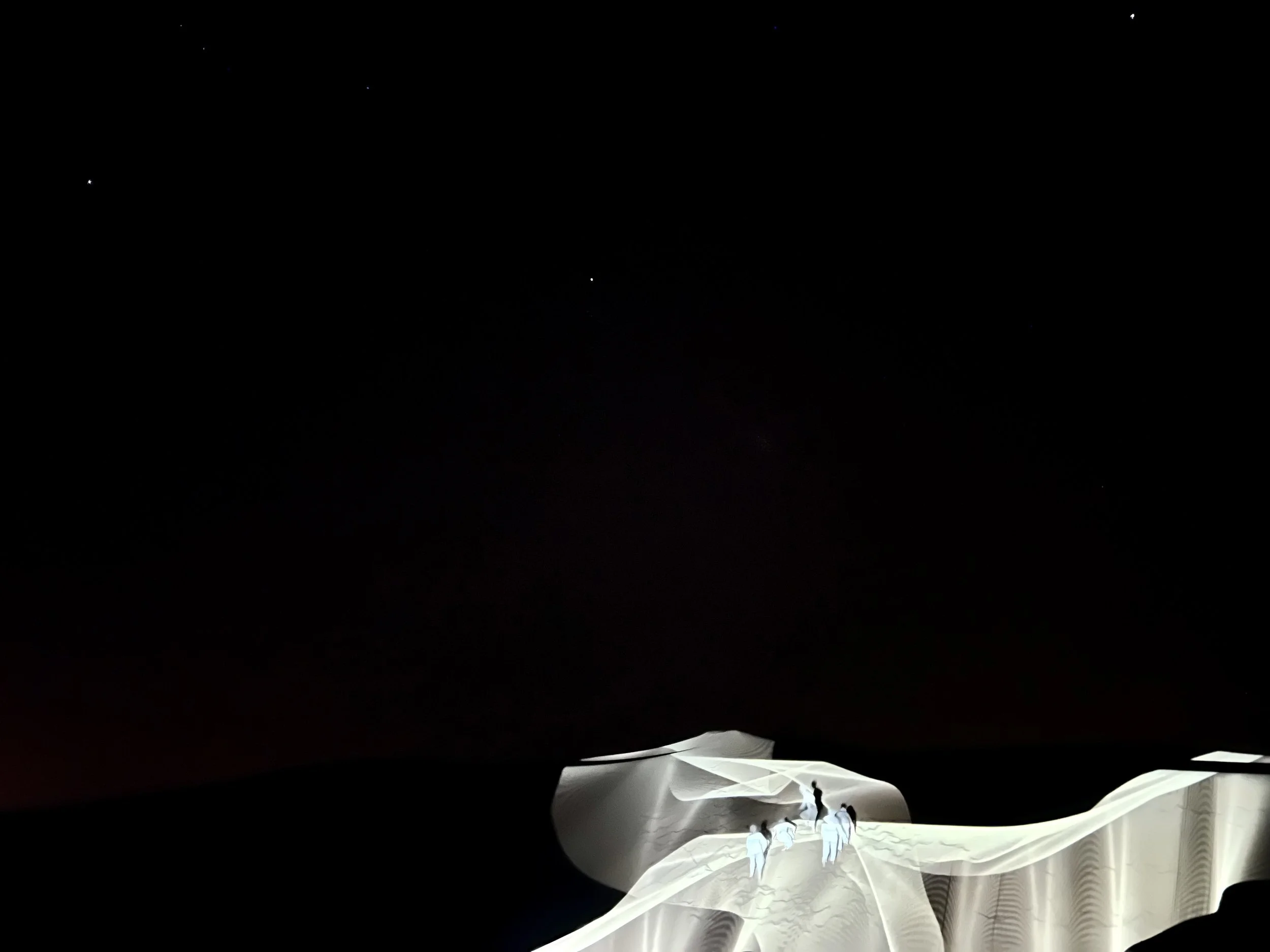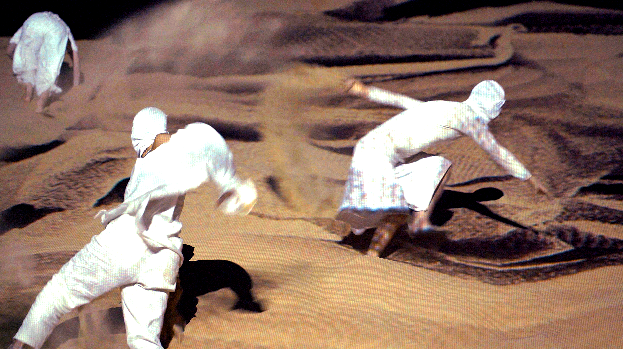 MUJO - 無常 (Japanese for impermanence), is a dance performance using the sandy desert as the stage, with visuals projected on a large dune in which the dance takes place. Dancers, visuals, and sounds constantly assemble and disassemble in various forms, in a struggle of emotions and change. We build and achieve some shape, but there is nothing to hold onto as everything eventually falls apart like sand. We explore this question: “How do we accept the fact of impermanence in our life?” through a repetitive pattern. There are two final outcomes: an immersive multi-channel film installation, and a live performance in the desert.